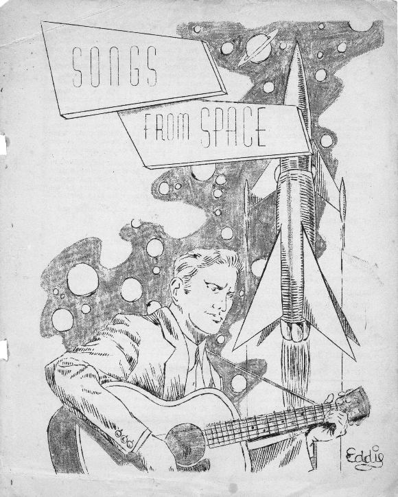 Parodies of well known songs with their original lyrics sharply and wittily reworked to be comments on SF and/or fandom are often referred to as “filk music”. The term came from the US apa, SAPS (Spectator Amateur Press Society), during the mid 1950s. As Harry Warner Jr explained in A Wealth of Fable: Presented here is what appears to be the earliest filking fanzine published in the UK, which is dated August 1957. It was published by Eric Bentcliffe, reworked lyrics were by Sandy Sandfield, and artwork by Eddie Jones. The final song, Space Club Drag, is inspired by The Space Club, a clubroom for London fandom that Helen Winick had tried to establish around the turn of the year.