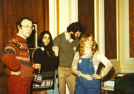 Joe Siclari: I went to the Albacon for a few memorable hours. But on Sunday we left early and drove all the way to Heathrow in a snowstorm. A short night in a B&B and then caught an early morning flight home. Around noon in the fanroom, Avedon was interviewed by Kev Smith. Afterwards Linda and various other female fans gathered around to talk with her on matters female and fannish. Peter Weston interjected a number of times with the male point of view until he and I began chatting, the first conversation I've ever had with him. Linda and I asked him if he'd be prepared to move the Brum group party to the following night to let us use that evening for a 1984CON party in the fanroom, and he agreed immediately.