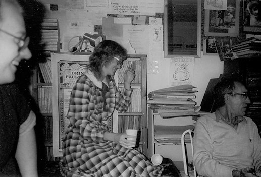 (I think this must be the occasion on which I gave Malcolm my spare mint condition copy of X-MEN #137, which was already shooting up in value even then, by way of recompense. If so, this was to auction off or sell to Forbidden Planet in order to reimburse Patrick. Months later, Malcolm turned up the fanzines. I *hadn't* had them after all.) I handed out TAFF ballots to all and sundry, collecting the first few votes in the process. Saturday 4th January Tidied the place during the day for tomorrow's Langford visit, and went over to Roz Kaveney's flat for a party in the evening. It was wet and cold once again, and Avedon and I were moved to exchange comments on just how bloody inaccessible her place is. We were the first to arrive, followed soon afterwards by Mike Dickinson (Jackie was visiting relatives in Scotland), and the four of us spent quite some time chatting. There was apparently a pre-party party somewhere to cheer up Abi Frost (a full-time occupation, it seems), which was delaying many people. Lin Morris, Malcolm Davies & Kate Solomon arrived next, followed eventually by those who'd been with Abi.