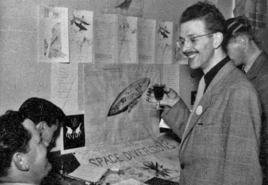 ROBINSON: Bill Temple was really on top of his form - crack followed crack without pause making his speech so good that everything else that followed that day seemed pretty dull... It could not be long before Bill made reference to the one and only Arthur Clarke. Mentioning Arthur's recent succession of book sales Bill mentioned that a fortune had been made from "The Exploitation of Space." Arthur we understand is now being referred to as Ego Head and Heinlein had called him 'The Man Who Sold The Moon.' Arthur was at present photographing sharks underwater, rumors wore that he was being investigated by Senator McCarthy for 'submersive activities'. Bill sat down to a very well earned round of applause. Other speeches in this item were by Ted Tubb, John Brunner, John Christopher and Vince Clarke - appearing in the guise of a huckster for the first time. Frank Arnold sounded very pessimistic; he said that from what little Stf he had read over the past few years, he gathered the impression that the stories were the same, the plots in fact had all been done before - I for one disagree. WILLIS: