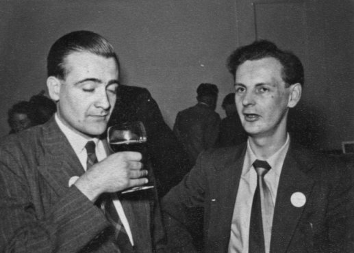CHUCK HARRIS (in HYPHEN #5): Burgess..... is, I think, part of my fate. He is also a serious constructive fan, and wears a cloth cap to show that he belongs to the proletariat. He reads Good Books and political autobiographies in the intervals between prozines, and he sold me a SLANT 1 at the Boncon. Burgess is even lower than a professional bookseller. Trusting fool that I am, I believed him when he said it was a Mint Copy. I paid him 9d,--- the full cover price --- and didn't bother to examine the magazine. After all the excitement had died down, and Bea had fled to France, I look through the mag before filing it away in my collection. There, halfway down Page 5, was the biggest, dirtiest, damn thumbprint I've yet seen. BURGESS, YOU TOLD ME THAT WAS A MINT COPY! That's not the only reason you're on the list, though. You remember when we held the first BRE type smokefilled room in 146, (and nyaaaaaaah to the Northern Rustics who boast that their room was smokier than ours)? It was a nice sociable little crowd, and everyone was on their best behavior because Bea, Rita Krohne, and Jesse Floyd were there, and we all wanted to give them a good impression of Anglofandom. Burgess, why couldn't you make whoopee quietly with that thimblefull of sherry and water that you were sipping? Haven't you any decent fundamental instincts? Whatever possessed you to start talking about science-fiction of all things, when everyone else was happily telling dirty jokes or quietly discussing sex? WILLIS: The party was being held in Rita Krohne's room, since someone was having hysterics in Bert's. There was no space here for anything like that----there wasn't enough room to swing a cat, never mind a cataleptic. The room was so small I wondered we didn't have to pay a penny to get in. I counted 26 people in it, and that was only the top layer. I arranged a code knock with James and left the Black Hole of Calcutta to reconnoitre the Liverpool suite again. On the way up I ran into Ken Slater, whom I'd met for the first time a few hours ago. We went, to his room, opened a bottle of whisky, and discussed the Transatlantic Fan Fund. Then we went up to the Liverpool suite. I'd only been there a few minutes when James and Madeleine arrived with the news that they'd all just been thrown out of Rita's room. ROBINSON: As the evening drew on plans were being made in every corner for smoke-filled rooms. The biggest seemed to be organised by the Liverpool group and most of the actifen had been invited. Finally the Con proper broke up -in fact it just disintegrated fan by fan. Not being able to remember which room the party was being held I made my way upstairs with ears attuned ready to catch fannish remarks to lead me to the room. Eventually I located the noise, and having practically forced the door, I found myself jammed into a small hotel room about 15 x 10 occupied by over 20 fen not counting the furniture. The fact that I'd gotten into the wrong party didn't worry me much as I soon found a whisky-bottle, and, failing to locate a glass, I discovered a weird looking piece of pottery that I assume was a flower vase; (at least I hope it was a flower vase), anyway, the whisky tasted good. Just about every leading fan apart from the Liverpool and Manchester groups was in the room somewhere and about a dozen different conversations were being carried on simultaniously. This was not too last unfortunately, as an official knock sounded on the door and a voice announced "Night Porter -- will you please go to your rooms." I wonder what he would have said had he seen how many were inside; he'd probably, have thought it was an orgy.