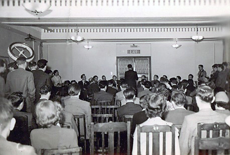 WILLIS: The Convention was due to start at 11am, and we took care and a taxi to arrive shortly afterwards so that in the event of its actually starting on time we should be on hand to carry out those who had fainted from the shock. But all was well ---at 11.30 Ron Buckmaster was still asking everyone if they had seen the microphone. Evidently someone, probably a Northerner, had taken the mike out of the Convention already. Someone suggested he should call for its return over the PA system. While the Committee were mulling over this we all milled around to the strain of Stan Kenton records. At 11.43 precisely Chairman Fred Brown apologised for the delay. He offered no explanation, and nobody expected one. He also announced the last minute cancellation of the showing of 'Destination Moon, due to the London County Council's unexpected objection to the showing of inflammable 35mm film in unlicensed theatres. Eviidently the Government had sneaked through the Cinematograph Act of 1909 without informing the Convention Committee. He also read a postcard from Peter Hamilton regretting that he might not be able to be present. Since Peter was actually standing just under the Chairman's nose, it looked as if he had delivered the postcard himself to save postage. Fred also announced the cancellation of the Junior Fanatics play, adding rather tactlessly that something better would be substituted.