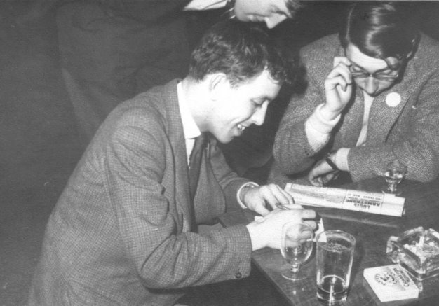 BENNETT: Friday's session was one of informal meetings. I met Jim Linwood and Brian Jordan for the first time and renewed acquaintances with Norman and Ina Shorrock (whom I had not seen for three whole weeks), Pete Taylor, Dave Cohen, Ken Potter, Ken Mclntyre, Ella Parker, Bobbie Wild, Bob Richardson, Eddie Jones, Sandra Hall, Ivor Mayne, John Roles, Paul and Joan Hammett and Norman Wansborough. MAYNE: The crowd of us went back downstairs and settled round a small table. Jhim and I wanted to talk about things generally since our last meeting had been some time ago. This was the first time we'd met Brian Jordan, so we all had a lot to talk about. In a way, it was just like the Globe, with the younger fen sitting on their own around a table and all the other fen talking round another. Later our little group broke up and Jhim and I spoke to Norman Shorrock and Ron Bennett. Ron, of course, was selling subscriptions to PLOY and The FanDirectory. No old mags this time, but he's got a new racket in TAFF. I hope nobody was stupid enough not to give money to a nogood character like Bennett. When the bar opened all the fen gathered round it - natch! Norman Shorrock was distributing copies of the programme, a very well produced book of 40 odd pages, and I do mean odd! JORDAN: We got quite a shock, when we found that a rumour which had been going round, proved to be true - the bar was to close early, in spite of previous promises that drink would be available most of the night.