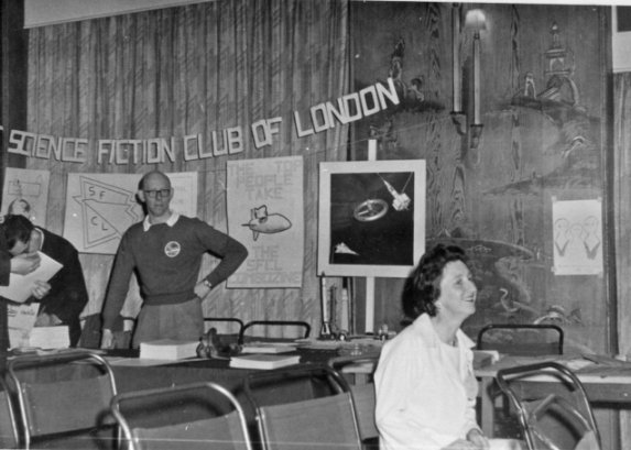 Down at the bar we found almost all London fandom trying to explain fandom to Geoff Doherty, a new BSFA member. He seemed pretty impressed and surprised. That such a group existed, and was asking a lot of pertinent questions, the answers to which he was to put to a good use later. We all adjourned to a Chinese restaurant for food, very good it was too. Much refreshed we made out way back to start our hardworking part of the convention. This was the setting up of the SFCoL table. Don Geldart had done most of the hard work already by making posters, models and planning a suitable layout. Ted and I helped with actually putting it together, while Bruce was busy at the OMPA table, and Jim at the BSFA table. The main items on our table were models of a rocket, with launching rig, personnel and transport. The smaller ship and space station were suspended in a frame against a black background, which was very effective. Whilst Don was busy setting these up, I was stringing together letters, which Don had cut out, to form the name of our club. These spanned across about ten feet and when they were up we were all satisfied that anybody who came into the hall would at least know who we were. It was now time to start our advertising campaign. This year the club made an all out drive to sell the Combozine, which had been specially produced for the occasion. We had adverts which were parodies of current mundane ads such as "Top people read the Combozine", "Unzip a Combozine" and "You're never alone with the SFCoL Combozine". Don had printed over a hundred cards with the inscription 'Get the SFCoL Combozine Now' and these were liberally sprinkled round the hall, into people's pockets, and many other likely and unlikely places. Anyone looking at someone else's display was likely to be confronted with one of the cards. Our greatest success was with Norman Shorrock who after removing cards from the Liverpool stand about a dozen times without ever seeing anybody put one there, came and begged to be allowed to buy a copy, whereupon we presented him with a free copy as he was an honorary member. Ted proved just how unbiased we were by writing on Norman's little card 'We also recommend Bastion'; a little gesture that left Norman obviously unmoved. We set off with Ron Bennett to find something to eat, and just when we were about to order, in walked Dave Kyle. RON BENNETT: Dave and Ruth Kyle were welcome visitors to the convention and are based in this country until the end of May. They will probably be taking a side trip over to the Continent. Dave was last at a convention in this country only last year but we haven’t seen Ruth since the London WorldCon in 1957. Ruth searched diligently for matzoball soup and Dave showed, at a room party, the cine shots he took at last year’s London Convention, shots which had improved several thousand percent over the films he showed at last year’s con and which are now only 100% perfect.