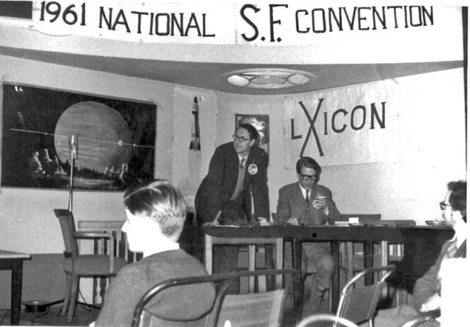 Arthur Thomson called them to order and got them started, a most fearsome sight that struck awe into the bystanders. Tubb, not having a shield made do with two swords. Had I not known he was quite friendly with his opponents, I would have sworn that he had his heart set on killing the lot of them. He would beat about one of them, whilst making frantic back handed swipes at any other opponent who passed within reach. Amis, who had managed to get a seat at the front, was cowering against the back of it. Bob Richardson, dressed in a sort of Mongol outfit, and Don made frenzied efforts to decapitate each other, right in front of Amis, and they didn't seem particularly worried about the possible loss of one of our leading writers.