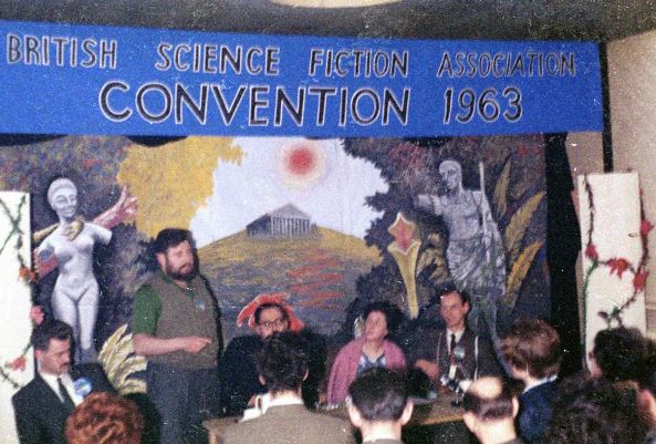 At an undisclosed time of night, Tom Boardman and I decided we should visit Ella and. Ethel in room 258. Unfortunately they were not alone, and the room was full of Jimmy Groves, to mention but a few. The talk there was more intellectual than in the pro room, and we discussed some of the points raised in the speech of Danish fan Harrison (whose cry "Elsinore in '64" had not been taken up). This was a very nice party, and I managed to get on to a bed with Frances Varley; Brian Varley was also there. They voted that I had the best red socks of the Convention, which was some sort of consolation. Eventually Tom and I left; the party was still going strong, and Ethel lay fast asleep on her bed. We went to look up the Harrisons, and found Joan in bed. Margaret joined us, and the five of us had a quiet little session on Joan's bed. It had to be quiet - the children snoozed only a few feet away. The tremendously high level of the discussion deteriorated after a while, notably when I could no longer resist a slice of midriff Joan kept on showing. I pressed a passionate signature to it with my ball-point pen. So Harry got to signing Tom with a sharp-pointed Parker '51. Having been signed and resigned, we resigned from the party, and tottered off to bed. Even the jolly sound of a corridor con upstairs could not lure us, though Tom went. We heard later that Mike Moorcock had been composing a new Elric story, with additions by various hands and censorship by Ted Carnell. Tom bought the result, all rights, for a penny. Last I saw of Mike and Ted, Ted was trying to get his ten per cent.... LANGDON JONES: I wandered upstairs, and walked round the hotel talking and lounging about. I finally wandered into Mike Moorcock's party. Mike was quite worried as I had paid him some money for booze, and then hadn't turned up to drink it. However I got as much of my money's worth as I could. Later I wandered out into the corridor and found a party going full-swing there too, at the top of the stairs. I remember passing Ted Tubb as he was reading the palm of Gerry Webb's girl and saying, "Ah yes, you are a woman of tempestuous passion..." and the girl looking up at him, drinking in every word. For some reason things began to get a little blurry. I remember collaring a bottle from somewhere, goodness knows where. Max Jakubowski was sitting at a typewriter, staring at a sheet of paper containing the words THE SHAVEN SUN. Mighod, thought I, what a wonderful title, I eventually persuaded him to let me type out the story, I got very engrossed in this epic, and just remember being infuriated by some woman called Ina Shorrock, who kept saying, "Ooh, we haven't got one of those on our typewriter..." and pressing all the available keys. Still, I unintentionally got my own back by confusing her with Inchmery. At last I perfected the epic to my own exacting satisfaction, and cried, "Look everybody!" There was silence. I looked up, and found that I was completely on my own, I picked up the typer and staggered downstairs to the lounge. There I found Mike Moorcock, Max Jakubowski, Ron Bennett and Ted Tubb. I gave the typer back, and collapsed into an armchair, I looked at the window, through which the light of dawn was greyly shining, and I thought with satisfaction, "well, at least I'll get breakfast tomorrow." There followed a drunken (at least on my part) conversation on the merits of Bradbury. Suddenly my memory of the conversation cuts off completely. I was manhandled into wakefulness by Ella Parker. The lounge was full of light, and people, I looked desperately at my watch. The time was 10.30 am.