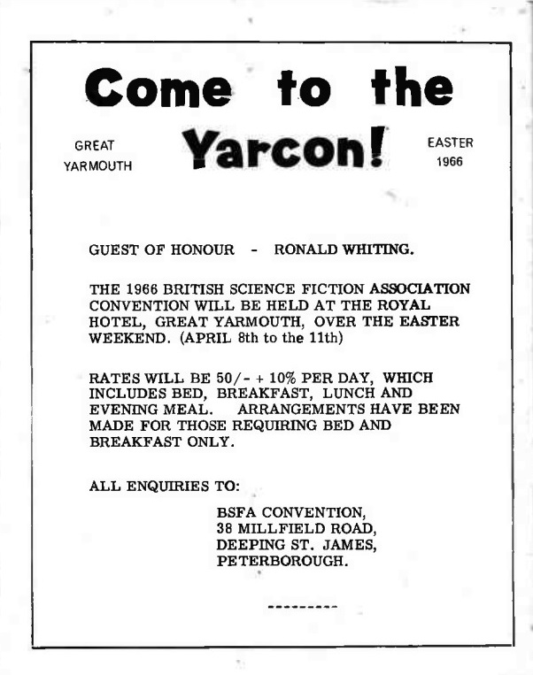Friday 8th AprilRON BENNETT:The eighth (and technically the last) annual Convention of the British Science Fiction Association was held over the Easter weekend at the Royal Hotel on the sea front at Great Yarmouth, Norfolk. Atrocious weather helped to offset the effects of the rival "convention" of mods and rockers that was being held simultaneously at the same resort. Contrary to public opinion these non-fan visitors were not plied with Norman Shorrock's home brew. Over 100 fans were present during the weekend.