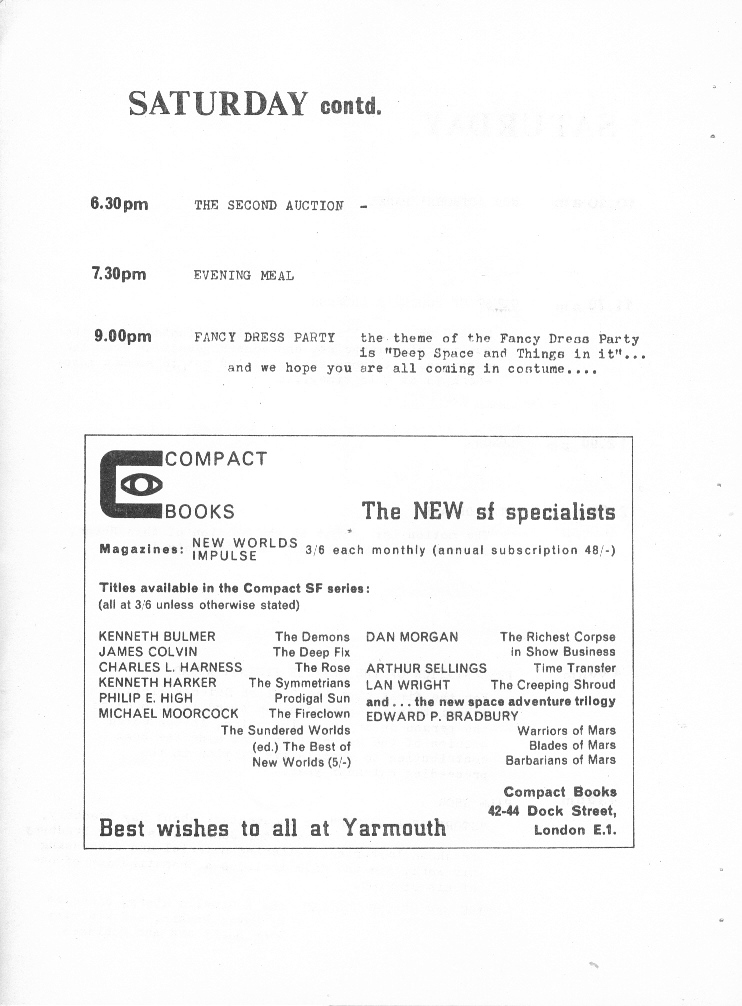 YARCON - THE PROGRAMME BOOKThe Eastercon 1966 Programme Book is 30 pages long (inc. covers), quarto, and tucked inside a green wraparound American quarto size cover. Those pages that are just publishers' ads, tourist info and the like have not been included here. What follows is more or less just the editorial material.No information on Progress Reports, if any.
