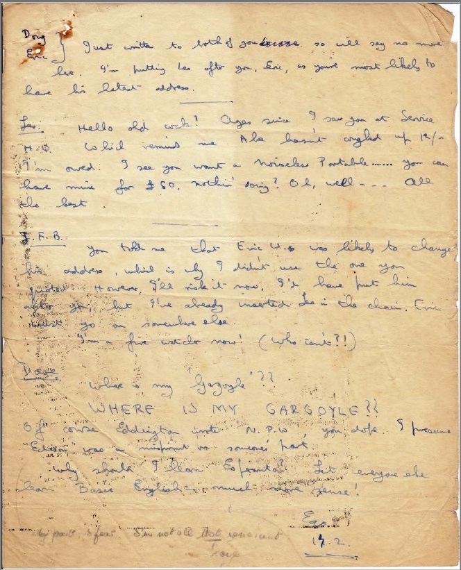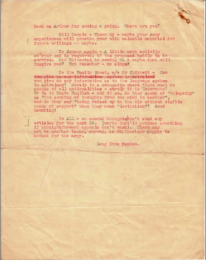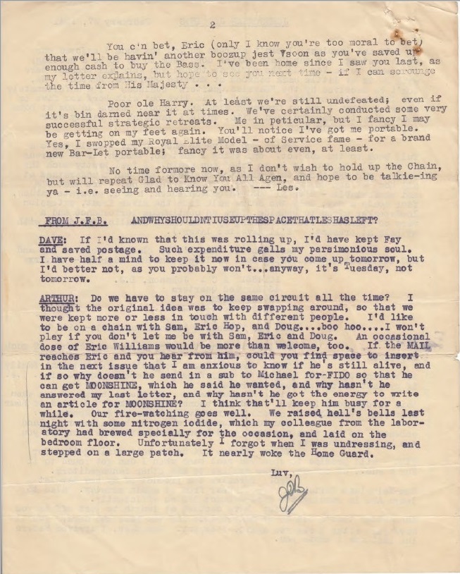 PPU = Peace Pledge Union HOW THE CHAIN WOULD HAVE WORKED (PROBABLY) According to its entry in the British Fanzine Bibliography, FAN-MAIL was produced in an edition of five copies. So a top copy plus four carbon copies, about the maximum you could produce at one time if you wanted the bottom copy to be readable. You would have had to have struck your typewriter keys pretty hard, indentation evidence of which should be clear on the originals of the above scans. When adding his contribution to the bundle he'd been sent and mailing it on to the next person on the chain, each individual would also mail his carbon copies to Clarke. You'll have noticed that the mailing card at the top of this page is labelled 'Copy 1'. It has five names on it, plus Clarke's. Since up to twenty-five people were on this chain we can infer there were eventually five copies going around, each copy-group containing no more than five people, plus Clarke, and each copy always ending up back with him. We can also infer that each copy went out with a different scribbled page of comments by Clarke attached - no carbon copies for him! This was FAN-MAIL #3. When sending out copies of a new issue, each would have included carbons of letters from the previous issue except obviously for those from the people in that particular copy group. What this meant is that as well as responding to letters from those in your copy group for this issue, you would also be commenting on letters on the previous issue from those in the other copy groups. This also meant that even leaving aside Clarke's scribbled page, no two copies of a given issue were ever the same anyway, though the juggling of top copies and carbons would've resulted in everyone eventually getting to see the same letters. Mostly. Whether who ended up in which particular copy group was random or not is obviously unknown - though I will note that most of those in this particular group are Liverpudlians. However, based on this complaint from John F. Burke those copy groups had become more rigid than originally intended: