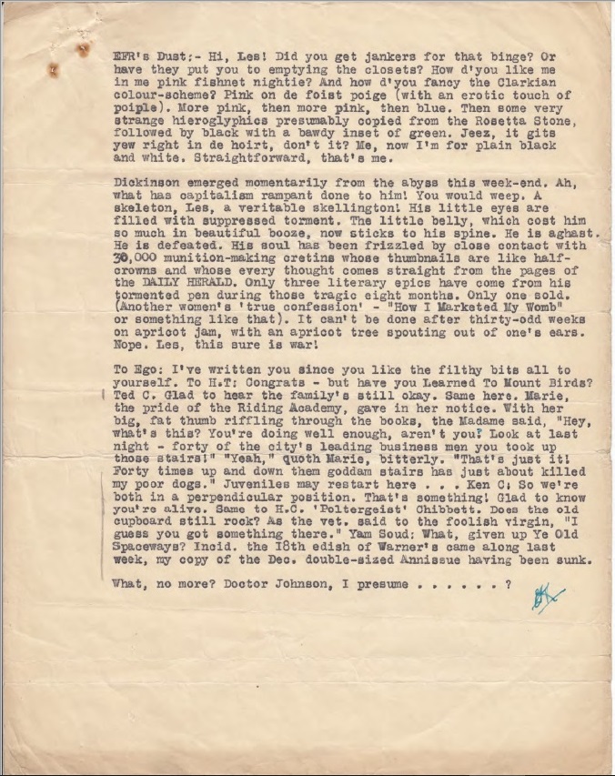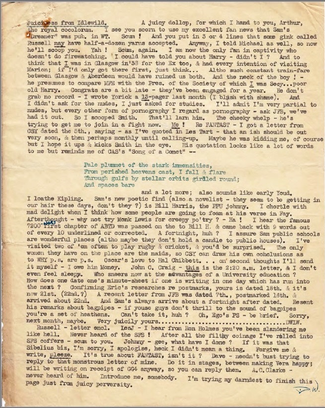 Do we have to stay on the same circuit all the time? I thought the original idea was to keep swapping around, so that we were kept more or less in touch with different people. I'd like to be on a chain with Sam, Eric Hop[kins], and Doug....boo hoo....I won't play if you don't let me be with Sam, Eric and Doug. An occasional dose of Eric Williams would be more than welcome, too. The mailing card for this copy shows that after it came back to him Clarke mailed it on to Ted Carnell. Either he did so without any carbon copies or these have been lost.