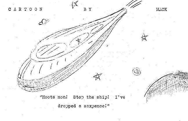 dropped in future. Also, without a doubt, the contents are far better. There are two definitely humorous articles which we think will serve as an antidote to the famous "No Grave!" We regret that co-Editor Burke rather ruined MACK's cartoon with a similar joke in the latest "Sally" but such unfortunate accidents are not always avoidable. In conclusion, we congratulate the S.F.A. on getting the "Satellite" as their monthly publication. Perhaps now Mr. Carnell will have time to improve "New Worlds", were such a thing possible. Colleague J.F.Burke writes from 57 Beauclair Drive, Liverpool "The cover is a bit odd - the space-ships are too highly decorated, and there are a hell of a lot of stars knocking about in the sky. Or is it meant to be symbolical? Anyway, no symbolism can account for the very squashed appearance of that guy's head in the foreground. What's the hard top to his shirt for -- must have taken some starching to get like that, and he's liable to cut his throat every time he looks round to watch a pretty girl go by. [Full of bright ideas as usual, -— that collar is shadow under Ego's chin!] The lettering is grand -- keep it like that. Before I go on, let me tell you a story. When this thing arrived, I gave a happy shout, and descended upon it. I then attempted to remove the sticky tape. After tearing half the back off [the advertisement of "Sally" we hope] I removed the tape from, the magazine, and transferred it to my thumb, where it remained. Several flicks of the index finger only served to transfer it to that finger and eventually I had to shove hard against the mantelshelf and leave it stuck thereon, to the subsequent wrath of my aunt who had some difficulty with it, I think. Tired of this, I cut all the tapes with scissors, opened the magazine to read it, and got caught on a loose end that was hanging over. For cryin' out in an unmodulated voice, use ordinary sticky paper, or, better still, buy some envelopes. Ego's poem failed to click. Nice, but not inspiring. Dave's little thing is very pleasant. I rather expected one of his usual demoniacal 'twists' at the end, and was surprised to find the ending so straightforward. [My fault - last two paragraphs editorially written] The next article in the mag is so good that I can't find words to describe it, [we're not surprised] but will just pass over breathlessly. "Dreamer 3" is nice - where's "Dreamer 2"? [Rejected] "No Grave!" - no more! In its way quite a good story, but rather unsatisfying, and certainly not good material for a fan-mag of this kind. Did you write it -— the name sounds artificial. Or maybe I'm wronging