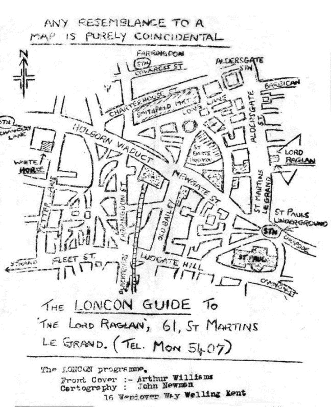 - ODD NOTES - The Lord Raglan is near St. Paul's Cathedral and St. Paul's station on the Central Line. See map on the back page. If you get lost ring up the pub and we will send a search party out for you. The Lord Raglan is open at 11.30 and on Saturdays a cold lunch counter is open. Members of the Convention committee will be in the Lord Raglan from 12.00 in case you wish to be along early and buy them a beer. Don't forget the auction......