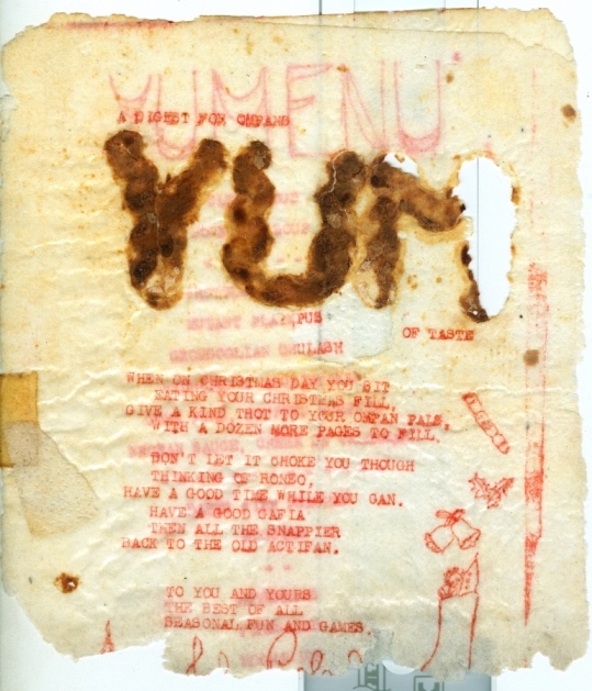 YUM (1954) Most fanzines have been ephemeral publications, intended for the moment rather than published with posterity in mind. Certainly those who created the early zines of 80 or 90 years ago would probably be amazed both that so many had survived and that anyone would still find them of interest decades later. However, ephemeral as they supposedly were they were not ephemeral enough for John Roles who created an edible zine/Christmas card on rice paper. Probably intended to last weeks at most one has, astonishingly, survived to the present day. Not surprisingly it's in very poor condition after 70 years, but we can still deduce things from it.