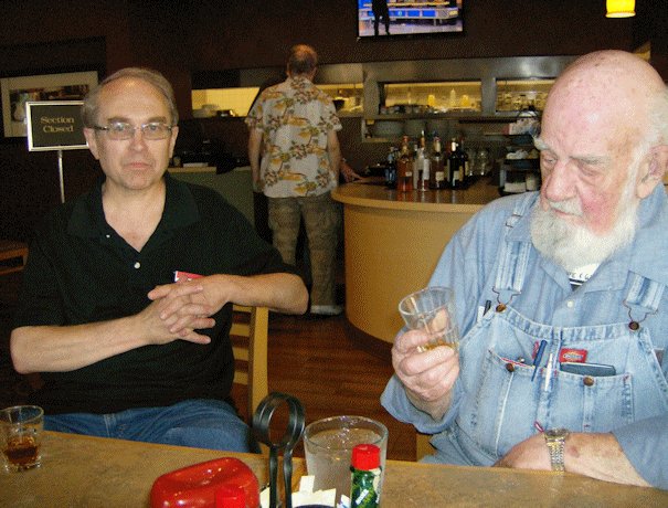 Getting up from the table I managed to knock my glass over. This had nothing to do with Ian's arrival. Fortunately, I'd finished my drink. Unfortunately, this being America, my glass was still mostly full of ice. Fortunately, only one leg got wet. Unfortunately, these were the only trousers I had with me. Fortunately, we've now reached the end of this paragraph. Doug told me they had been touristing with Spike and that at a gift shop on one of the impressive local mountains she had bought a small model of a beaver. "And, yes," he assured me, "we did make all the obvious jokes." I'd have been shocked if he hadn't. It's good to see younger fans maintaining traditional standards.