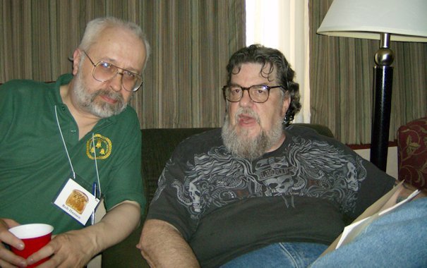Everyone moved up to con suite when it eventually opened its doors at 7.30pm. A three-room spread at the end of a fifth floor corridor, it looked as if it would be a fine space for partying. As we entered, so Dan Steffan announced the immortal words: "The beer is in the jacuzzi!" Isn't that wonderful? I want those words on a T-shirt. Nor was he kidding. The beer was indeed in the jacuzzi, and the jacuzzi was hard up against the bar. I don't know who would design a room like that, but I want to shake their hand. Next to the jacuzzi were two beer kegs. These contained a beer everyone simply referred to as 'red'. As soon as I tried it it happily became my drink of choice for the remainder of the con. Had the con suite been open more often then I'd have drank more of it. I got a big hug from Lynn Steffan and a sweaty handshake from Dan. It was great to see them both again after so many years. Both now had longer hair, and Dan had acquired the long, shaggy beard of an old testament prophet, dark and shot through with grey.