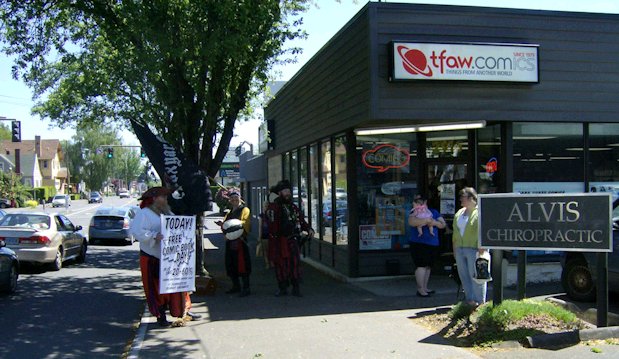 Today was Free Comic Book Day. I only knew this because someone had asked about it during yesterday's opening session. I'd been intending to check out a local store anyway and pick up this week's arrivals, hence yesterdays abortive search, so I resolved to do so now while it was still early in the morning. Ulrika decided to join me so that we could each catch up with what the other had been up to lately. My calf was still throbbing so I figured the walk could only do me good. Based on Dan Steffan's description of the comics store as being within walking distance I also figured it couldn't be too far away. I figured wrong. As we trekked through mile after endless mile of insufficiently shaded street, a ferocious sun beating down on us, I started to feel really guilty about Ulrika being along with me. I'd promised her a brief walk and this was turning into anything but. It wasn't 'walking distance' as that phrase is generally understood by most people. Indeed it was 'walking distance' only in the sense of containing both 'walking' and 'distance', lots and lots of 'walking' and 'distance'. Many and colourful were the muttered imprecations I heaped on the hairy head of Daniel J. Steffan. Eventually we reached the comics store - Things From Another World. We could tell we'd reached it even before we saw it. This was because of the pirates.