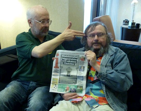The con suite had opened by the time we got back to the hotel. I poured myself some red from the keg and we sat chatting with Linda Deneroff, Bryan, Elinor Busby, and Milt Stevens until the first program item of the afternoon in the St. John suite. This was 'The Class of 1970: A Fannish Tribal Reunion' featuring Jeff Schalles, Dan Steffan, John D. Berry, Frank Lunney, and 'Bill Kunkel's Ghost'. A fascinating panel, it covered an era of US fanhistory I know little about. Jay Kinney joined in from the audience and was quickly drafted onto the panel, as was - once again - Michael Dobson. Dan told the story of an early convention they were at where he was the only one who had a room so the others all slept on his floor. "We all had our assigned spots on the floor," explained Frank, "all except John D.Berry who announced that he would be sharing the bed with Dan. John didn't do floors; he always took the bed."