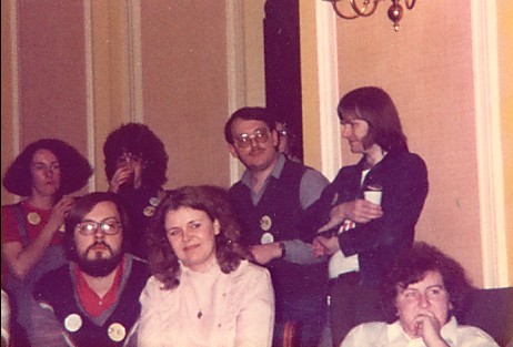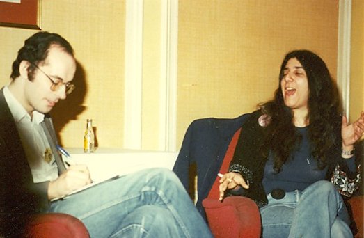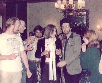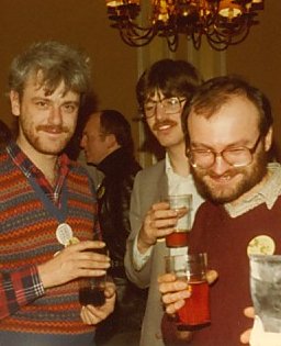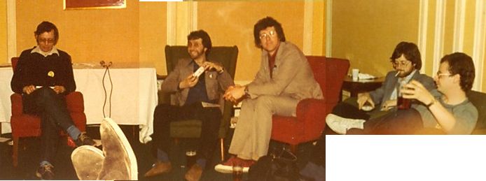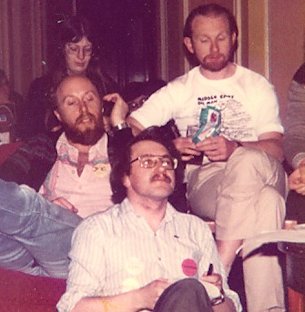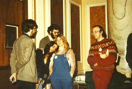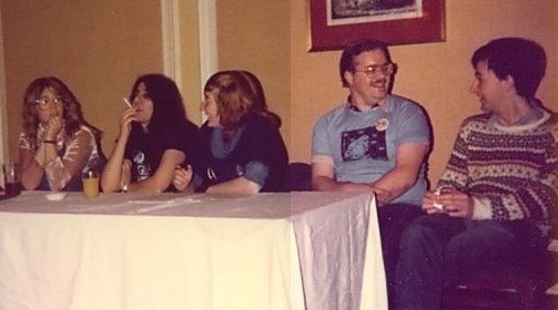 Joe Siclari: I went to the Albacon for a few memorable hours. But on Sunday we left early and drove all the way to Heathrow in a snowstorm. A short night in a B&B and then caught an early morning flight home. Around noon in the fanroom, Avedon was interviewed by Kev Smith. Afterwards Linda and various other female fans gathered around to talk with her on matters female and fannish. Peter Weston interjected a number of times with the male point of view until he and I began chatting, the first conversation I've ever had with him. Linda and I asked him if he'd be prepared to move the Brum group party to the following night to let us use that evening for a 1984CON party in the fanroom, and he agreed immediately.