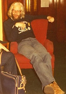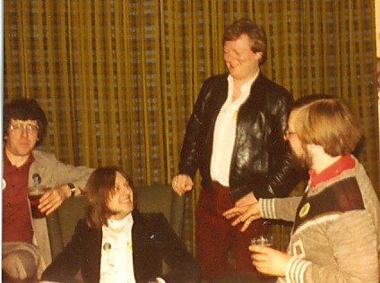 My long-held belief that there is no justice in this world was re-affirmed by the discovery that while Linda's hotel would let her have her room at 8.20 am, with a resultant fall into the sweet arms of Morpheus, my own wouldn't let me register before noon. I killed the time as best I could but even two circuits of the Glasgow Metro - which to we big city sophisticates who regard even the London Underground with jaded disinterest seemed like something out of an amusement park - did little to allieviate the boredom. When I did finally get to bed I managed to grab no more than a couple of hours sleep before Linda woke me by phoning and demanding to know why I wasn't handing out 1984CON badges. Sighing, I dragged myself out of bed, dressed, and went among the milling throng, handing out badges to all and sundry. I spent most of the evening renewing acquaintances and drinking, before crashing out.