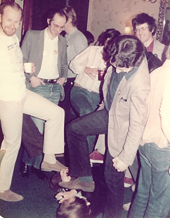 A week or so before the convention I was more than mildly surprised to receive a letter, with a London postmark, from Joe D.Siclari who was in town and wanted to meet up with local fans. As it happens it was impossible to get any sort of meeting together until the Wednesday evening before ALBACON when a special One Tun was held so that local fandom could meet Avedon and Avedon could see local fandom in its natural habitat. Joe also attended ALBACON and he brought along copies of A WEALTH OF FABLE, which I've wanted for years, and his facsimile reprint edition of issues fourteen through seventeen of QUANDRY. I was oddly disappointed in the latter, even though it contained a column by Willis. I'm probably as familar as anyone in this country who wasn't actually around at the time with the events and personalities of the period (and I've made no secret of my admiration for the works of Willis as reprinted in WARHOON 28), but even allowing for any lack of knowledge on my part and making due allowance for some of the attitudes expressed being those of a world thirty years gone, it was still somehow less than I'd expected it to be. QUANDRY was undeniably a good fanzine but on the basis of this volume it wouldn't get into my personal top half-dozen. Greg seems to be getting a little more involved in things lately than he has done for some time. When we were up in Sheffield a few weeks ago at a party thrown by local fan David E.Bridges (possibly the most underrated fanwriter in Britain) he not only promised Harry Bell an article for a future OUT OF THE BLUE but arranged a tape-interview with me as well. I'd originally wanted this as a part of my research into the Ratfanhistory I intend to write eventually (it's still on the back-burner) but Greg suggested expanding it beyond this and then either running the transcript in a couple of installments or using it as the basis for a short series of articles. This sounds OK to me so I'll doubtless set it up in the near future. He's also agreed to do a fanzine review column (his first in five years or so) for a future MATRIX after having been outraged at the column by Martyn Taylor in the current issue. Should this come to pass, and you're interested, I'll send you a xerox. Talking of tapes, I recently discovered that a tape still existed of Leroy Kettle's FGoH interview at the 1978 Eastercon and arranged for a copy to be made for myself. I was at the original session and though I'd read the transcript that appeared in a contemporary fanzine (WALLBANGER 1) this was the first time I'd heard the tape. Kettle is a little stiff at first but he soon warms up and I found myself laughing so hard at some points that there were tears rolling down my cheeks. It never ceases to amaze me that Kettle is, if anything, funnier in person than he is in print. Wonderful stuff! (The recording and transcript can be found here.) Wednesday 4th May Greg phoned to brief me on the latest news from Newcastle, unaware that Harry had already given me all this information on Monday. He also reminded me not to forget tomorrow's pre-One Tun committee meeting cum meal. As usual I haven't actually given any thought to the convention at all since we discussed it which means that I never actually present any proposals. My rationalisation for all this is that I operate best when picking up trains of thought from things other people have said, playing with them, and bouncing them off the others. This sounds fine and good and even - dare I say it - 'artistic', but I think words like 'sloth' and 'lethargy' describe it equally well. Thursday 5th May The first Thursday of the month, and hence the night of the One Tun. (I'm sure I've begun previous month's entries this way - must be more adventurous next time. Greg, Linda. Abi and I met at the restaurant opposite Farringdon tube station straight from work and we all, rather unimaginatively ordered the spaghetti bolognaise. The purpose of the meeting, far from merely being a prelude to drinking, was to discuss the current state of play re MEXICON. Having had the green light from the Newcastle end we all agreed that it was a good idea to go with Harry's suggestion and travel up there at the end of the month, have a full committee meeting, and - purely coincidentally - to party, and to have an Indian meal at the excellent Al Firdous. At the Tun itself I spotted comics fan Dave Harwood by himself at the bar and engaged him in conversation. It turned out this was his first One Tun so I felt good about helping him to enjoy it (at least I hope he enjoyed it.) I'd forgotten how volatile Greg can be since it's been a while since he last exploded, but unfortunately he blew up over something Lilian Edwards said, calling her "...a nasty little jerk..." among other things. Since I was talking to Christina Lake at the time, I have no idea what she may have said to provoke this.