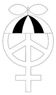 (It was around this time that Linda Pickersgill and/or Chris Atkinson asked me to draw up a badge they had designed that combined the female symbol, the CND emblem, and the propeller beanie used to signify SF fans in cartoons. I thought this was ingenious, so I took their scribble, drew it up - see recreation below - and they had badges made up incorporating it for 'Feminist Fans Against The Bomb'.)