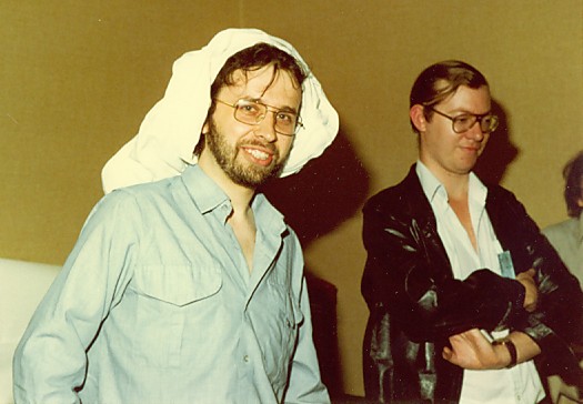 Saturday 27th August After the 'Ian Williams Debate' - in which Ian was quickly shouted down and silenced as usual - the discussion continued and an apa was formed. Christened 'Frank's Apa' by Tony Berry, it was Mike Hamilton and Harry Bell who pressed for its formation and Greg who somehow ended up as OE. Be interesting to see where this goes. Prior to the con we had all been asked to fill out questionnaires about fandom and the results from these had then been tabulated to form the basis of a quiz. I was on one of the teams, and one of the questions asked was who those who filled out the questionnaires thought was the best looking British male fan. We suggested Malcolm Edwards then Joseph Nicholas (who came in second and third - or was it third and second?) but couldn't guess who was first. Turned out it was *me*! Wow. Up 'til now D West's candidacy had been largely a gag, but Joyce Scrivner appears to have talked him into standing for real.