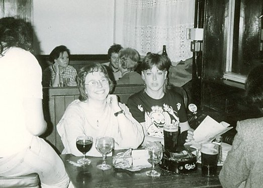 The fannish contingent included Greg & Linda, Lucy, Kate Davies, Abi Frost, Nick Lowe, and Geoff Ryman, but we were outshone by Roz's transsexual friends. Afterwards, we set off home from the party with Gamma, Colin Greenland, Lucy, and the Pickersgills, and decided to try an alternative route by taking a bus to Liverpool Street and the Central Line to Mile End. Unfortunately, this proved no quicker or more convenient. Wednesday 11th July Met Avedon during my lunch break at the George, a galleried pub near my bank. I'd assumed this was a cute, out-of-the-way little pub and was mortified to discover it listed in tourist guides and so pretty busy. Still, their chili was very good, though Avedon stuck to bread and cheese. The pool session that evening at the Salisbury was Lucy and Avedon's last chance to see Kettle and Brosnan this visit. Sunday 15th July I finished the cover for RUDE BITCH #2 (aka DEAR RUDE BITCH) that I started yesterday, and Avedon spent ages staring at it. It was also much admired at Friends In Space that evening, where we were joined by Martin Tudor and assorted students.