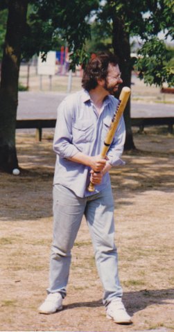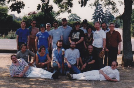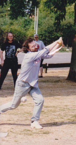 This item concludes Saturday's official programme. Thereafter you are encouraged to drink, talk, make merry, and to enjoy any sexual assignations you may have been fortunate enough to make, because on Sunday there awaits:To my great surprise, I was the first to be picked for his team by captain Jack Heneghan who obviously thought my height and my still just discernable waistline indicated ball-paying potential. Boy, was he in for a shock! On the Other Side were Martin, Jim Young, Christina Lake, Carrie Root, Joseph Nicholas, Keith Oborn, and Mike Scott, all ably captained by Andy Hooper, while our side consisted of me, John Harvey, Lynn Steffan, Peter Hentges, Peter Roberts, Tom Whitmore (who'd got our e-mail message after all and decided that PRECURSOR sounded pretty nifty), and Mike Ford, under the sterling captaincy of our leader, Smoking Jack Heneghan. (Literally smoking. I'm not that familiar with the game, but surely it's not usual for the guy at bat to be puffing away on a Marlboro?) Dan Steffan was the umpire. There were two injuries in the game, both of which were sustained by Jim Young. The first of these occurred when Jim made a diving attempt to tag Mike Ford as Mike leapt for first base. This left Mike hopping around and Jim lying on his back, clutching his forehead. (Later, Jim confided in me that the game had been the most fun he'd had all summer, and definitely more fun than the US tour promoting his new SF novel, ARMED MEMORY. "So, you're saying a book tour is less fun than being kicked in the head?" "You've got it.")