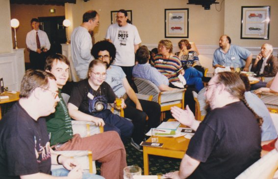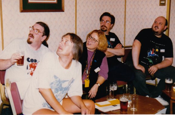 THE PRECURSOR INTERSECTIONAll photos by Geri Sullivan.In keeping with the eco-friendly principles we all strive to live by, this convention report contains at least 30% recycled material by weight, said material being my programme notes.... Welcome to PRECURSOR, the convention for those who can't afford INTERSECTION and those rich sods who can afford both. This all-expenses spared leaflet is the programme and should be read immediately as it includes all manner of information vital to your enjoyment of the convention, spiritual health, and regular bowel movements. Should you have any queries the committee will be glad to help you with them. We are, of course, Rob Hansen, John & Eve Harvey, and Martin Smith, though just for a laugh we'll be wearing badges identifying us as Joseph Nicholas, Dan & Lynn Steffan, and Martin Smith. We'll be delighted to answer all your questions in detail and at length.Friday 18th August 1995 did not begin well for me. The previous evening Martin had phoned to say he was ill and wouldn't be at our regular Thursday night pub meeting. He thought he had flu and said he might not make PRECURSOR either. This would be an enormous tragedy for the con because he was bringing along the equipment for Sunday's softball game. While frantically trying to contact Jim Young to get him to bring his softball gear along, I decided to check the days e-mail...and discovered that Avedon had offered Tom Whitmore crash space here at Gross Manor when he flew in from California tomorrow. Arrgh! Leaving Avedon to send an urgent e-mail message to Tom while praying he hadn't set off for the airport yet, I drove over to Welling to pick up Vince Clarke, hoping against hope this wasn't all a taste of things to come. I needn't have worried. After driving Vince, Avedon, and our houseguest, Neil Rest, up to Stevenage and the Hertfordpark Hotel, venue for PRECURSOR, we settled in for what was to be a pretty good little convention. Chuch and Sue Harris were already at the hotel when we got there around 2.00pm, as was Peter Hentges, and we were soon joined by Andy Hooper, Carrie Root, Geri Sullivan, Dan and Lynn Steffan, Ted and Lynda White, Mike Abbott, Anne Wilson, Vicki Rosenzweig (who'd also been at last night's Fanhattonite meeting in London), Anne Wilson, Bridget Hardcastle, Jack Heneghan, my fellow concom members John and Eve Harvey and, most amazingly of all, Peter Roberts who was attending his first con in more than a decade. "Peter's in advertising," I explained to John, "which means that someone like the head of the Chocolate Marketing Board will come up to him and say: 'Quick, we need a slogan that will make people buy more chocolate!' 'Eat Chocolate, It's Yummy!' replies Peter. 'Great' says the man from the Chocolate Marketing Board, 'here's two hundred thousand pounds'." "Actually," laughed Peter, "I quit advertising years ago. I'm a taxonomic mycologist now." "Good for you!" I enthused, trying to sound like someone with a clue as to what a taxonomic mycologist might be.