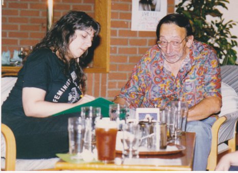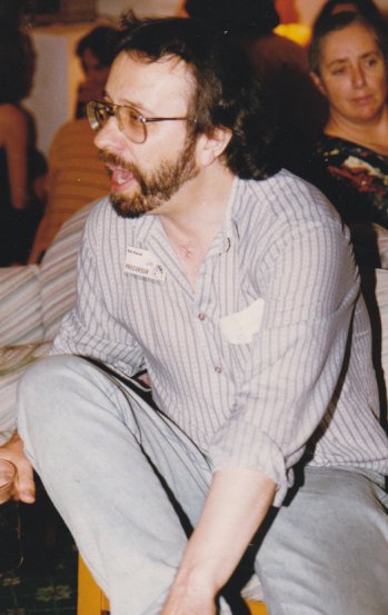 QUESTION TIME (Commencing about, oh let's see, 3.30pm or so)We'd talked Joseph into being the moderator during a party for GUFF winners Ian and Karen Pender Gunn at his and Judith's house the previous Saturday. Predictably, Joseph drank too much and fell asleep in a chair, leading to an immediate call for felt-tip pens. Ever protective of him, Judith refused to let us scrawl the usual tasteful and understated graffiti on her comatose spouse, so instead I put a bucket at his feet and a card in his lap that read: I DIED IN THE WAR FOR PEOPLE LIKE YOU. PLEASE GIVE GENEROUSLY. And they did. The sound of coins landing in the bucket, all of which were later donated to GUFF, was matched only by the flashing of a multitude of cameras.... ((I was to shamelessly recycle this same gag in 1998 at CORFLU UK when I placed this same sign on the unconscious form of a drunken fan in the hotel bar who shall remain anonymous in order to protect Martin Smith.)) On the panel with Joseph were Pam Wells, Ted White, and Chris Croughton. Not surprisingly, the topic that generated the most interest was next weekend's INTERSECTION and whether or not Worldcons in general were a good or bad thing for British fandom. No firm conclusions were reached. Sadly, the panel failed to debate my own, eminently sensible question (and here I paraphrase from memory): "Does the team think the increasing visibility of SM and fetishism at US cons, as characterised most recently by the fascinating (I'm told) alt.sex.bondage parties at DISCLAVE, represents any threat to traditional fandom, or do they agree that the general ambiance of British cons would be greatly improved by having more young people parading around in leather and chains?" THE TALK SHOW (9.30pm sound good to you? Sounds good to me, too....)With Martin's voice now a whispered croak, that gag about Marcel Marceau was taking on unintended significance so, by mutual consent, the chat show was cancelled. Everyone was having such a good time in the bar anyway that it would've been a shame to disrupt them. Martin's intended interviewees had been Pam Wells, Dan Steffan, and Andy Hooper, who'd all found other distractions.... "The British have smaller balls than we do," declared Andy, in an outrageous ethnic slur, "and smaller holes, too." He did not approve of British pool tables. Mean and moody, Andy took a singular approach to the game, apparently not realising it was only the balls on the table he was supposed to go for. Or so we assume. I was the first person the white ball narrowly missed; Dan Steffan was the second. Thereafter, the faint-hearted dived for cover whenever Andy took to the table, while those male fans with the necessary sang froid casually slid a hand over our testicles. The final official programme item of the evening was a cheese and punch party to celebrate Bridgit Hardcastle's birthday. Good food and punch, too, but the infernal heat we were cursed with all weekend finally drove most of us back to the cooler confines of the pool room.