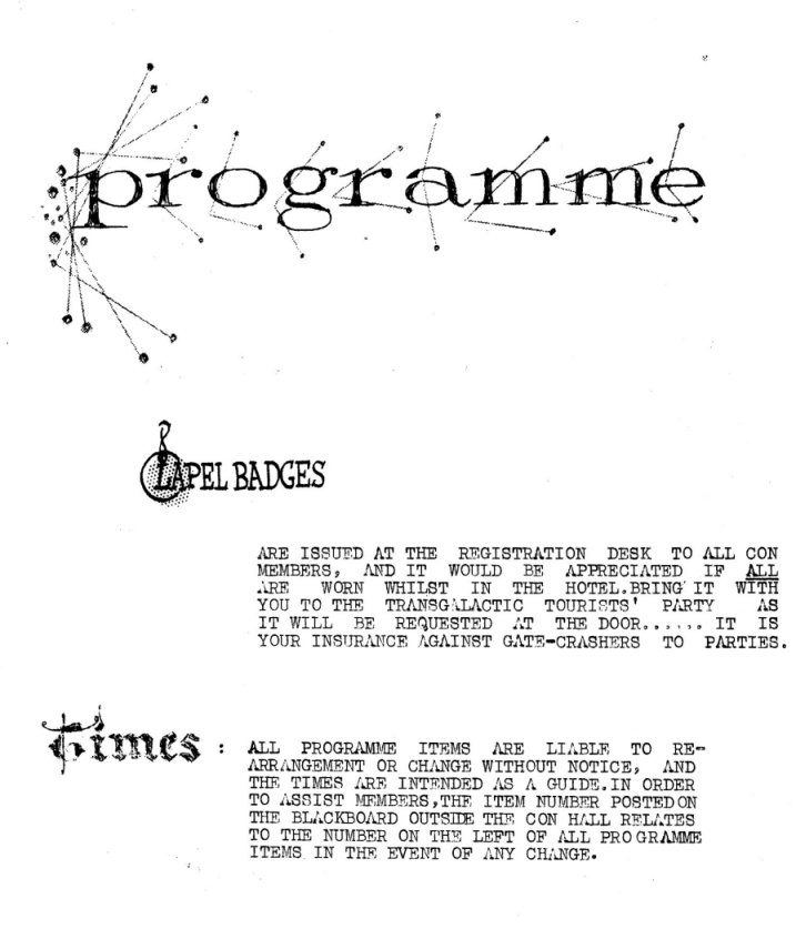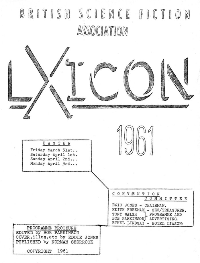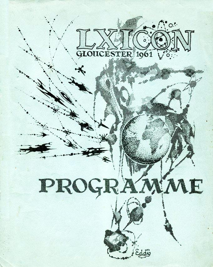 LXICON - THE PROGRAMME BOOKLETThe Eastercon 1961 Programme Book is 40 pages long (plus covers and excluding blank pages). Those pages that are ads have not been included here. What follows is just the editorial material. Design, headers, and artwork (drawn directly onto wax stencils) by Eddie Jones, production by Norman Shorrock.