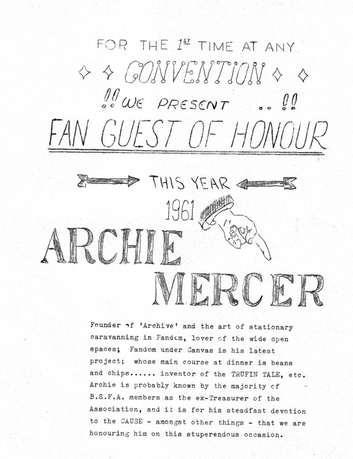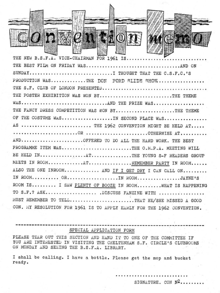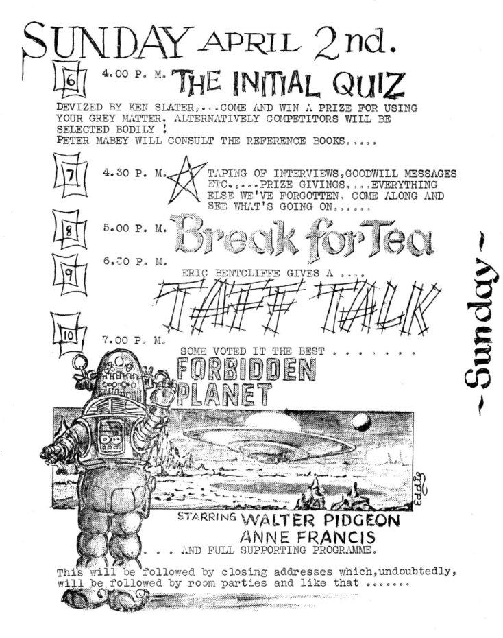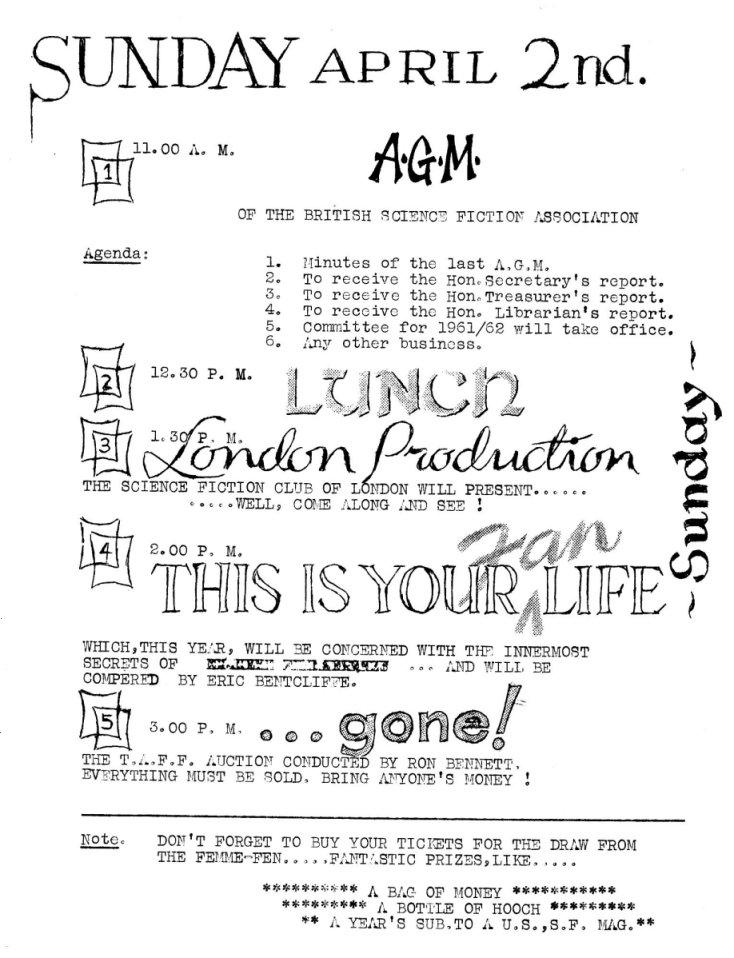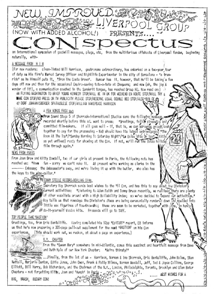 representative) that it is a very wonderful thing.As often as is financially possible an election is held, and the nominated fan who receives the greater number of votes is sent (carriage paid!) to the years major convention across the ocean. Naturally, the Fund alternates between America and the United Kingdom. THE TRANS-ATLANTIC FAN FUND is off to a fine start this year' largely due to the generosity of American Fans at the Pittsburgh World Convention (1960) and to the Convention Committee who orgahised the affair and who were kind enough to send a sizable donation to TAFF after they'd balanced their books. NEVERTHELESS ...your VOTE and your help is still needed, particularly so if your friendly TAFF administrators are to succeed in their aim of not only having an American TAFF Representative at the 1962 British Convention, but also to send a Representative to that years World Convention in America. IF YOU HAVEN'T ALREADY VOTED, grab like quick a VOTING FORM (They'll be available at the Convention), and hand it to Eric Bentcliffe with your subscription. Minimum subscription 2/6....there's no maximum. AND WHILE YOU ARE SPENDING MONEY! TAFF REPORTS generally make rather interesting reading, and you can order two of these at the same time you vote. There's the story of Don Ford's 1960 visit to England (and France), TAFF BAEDEKER, price $1.25 or 8/6. And Eric Bentcliffe's EPITAFF, the tale of his visit to.Pittsburgh and America.... 7/- or One Dollar. Both reports run to almost one hundred quarto-pages, and profits from the sale of both go to TAFF. Which, latter, reason is why they are being sold. Both Don and Eric feel like giving out free-copies to everyone in thanks for their wonderful trips but this way they can pay TAFF back a little for what it did for them. SHOULD YOU BE UNABLE TO READ this at the convention ...due to having inadvertantly drunk one of Norman Shorrock's specials too quickly, your hands are shaking too much after seeing Galactic Tourists all over the place (Rumour has it that this year Brian Burgess is coming as Himself!) You can send your vote postally to either TAFF Administrator (make postal. orders or cheques payable to them personally, please, not to TAFF).