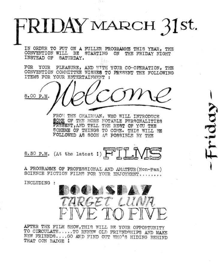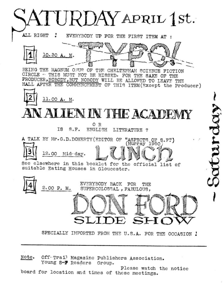 Outstanding in the fact that we have with us Mr Kingsley Amis, who has rendered S-F a great service this year with his book "New Maps Of Hell" ....... outstanding because we have had full cooperation from the publishers whose displays you will see around the hall ..... outstanding in many other respects as you will, in due course discover. The Convention Committee welcome those of you who have been fortunate enough to be physically present -- and those of you who, from a distance, support this annual gathering 'of the clans' we welcome with this souvenir programme booklet as some light recompense for your absence. All Convention members will receive the Final Report which will follow in due course....... To those of you who have just received this programme at the registration desk, we would like to point out two things. The first is the Map of Gloucester (at the end of the Programme Section), the second is the Official Eatery Guide which is used in conjunction with the map. Usually much time is wasted looking for cafes, so we've pointed out the best - and in one case the ONLY one which is open on a Sunday! We hope that the lesser gourmet find it useful! The Programme, as in all previous years, will be adhered to as far as is possible, and we do ask those of you who are presenting programme items to be on hand and 'ready to go'! Each programme item has been allotted a NUMBER which you will find on the left-hand side of the appropriate page. This number will be displayed on a black- board outside the Con Hall and you are asked to refer to it in the event that we have to switch items. Notices regarding other meetings may be affixed here.... Finally, as Chairman of the 1961 Convention, I would like to thank all those who have worked so hard to make this Con possible, especially NORMAN SHORROCK who produced this booklet in almost a last minute rush. I am sure that their efforts will be rewarded if you all have a wonderful time......... To next year's Convention Committee (whoever they may be) we throw out this challenge ....... we have laid the foundation blocks.... can you use them to build an even better Con next year?