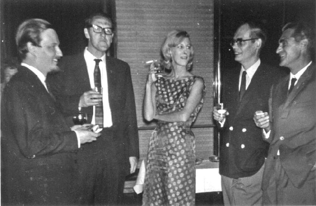 Bob Silverberg suggested that we should isolate our fear of robots which he claimed was not a fear of robots putting road sweepers out of work - "We've lived with that problem since the Industrial Revolution" - but more a fear of the berserk computer, the computing machine which begins to programme itself, where the control is taken from our hands. Anderson felt that such an occurrence was unlikely, saying that we could always pull out the plug or refuse to read such a machine's silly advice, concluding that a computer's main worth is to give good advice in a complex situation, presenting the optimum way of doing something in a given set of circumstances. He admitted that there are problems impossible for a robot to solve, but felt that a properly functioning robot would manage to get members of a panel into a convention hall on time at 10 a.m., and would ensure that an audience of seventy and a panel of five would function at an optimum level. TERRY CARR: I do remember inviting every former TAFF delegate at the con to a summit meeting at which we discussed TAFF policy and especially the next TAFF election; it was at that meeting that I proposed 'Hold Over Funds' as a choice on all ballots (thereby anticipating No Award by several years), and most people agreed to it. At that time, even as now, some people were worried that there might not be a qualified TAFF candidate to be found; but though the 'Hold Over Funds' option has appeared on every TAFF ballot since then we've never yet failed to find a candidate to elect. Someone took a photo of the attendees at this meeting and I still have a print of it: it shows all of us, with spouses, crammed onto one bed (no, no, it wasn't that kind of party!): Ron Bennett, Ethel Lindsay, Wally Weber, Ken and Pamela Bulmer, Arthur and Olive Thomson, Carol and me, Walt Willis, and all the other TAFF winners up to that time except Don Ford, who wasn't there. I suppose it's a Historic photo; I'd planned to put it on the cover of my TAFF report, but of course I never wrote that. (Don Ford had of course died in April that year.) RON BENNETT: Banquet tickets for the thirty-five shilling ($5) meal had been sold out by the end of the Convention's first day and with the seating limited to 150 there were reports of tickets being offered for sale by as much as £4, though it is not known whether there were any takers. The menu was: Consommé aux Etoiles; Filet de Sole Sullivan; Contrefilet Rose Perigourdine, Crottled Greeps and Pommes Amandine; Peche Jules Verne. Coffee and a glass of Pere Jean wine (for the traditional toast) rounded off an excellently prepared but sparsely presented meal. Opinions of those approached upon the matter seemed well united, that the proportions were small, that the service was disappointing, that the meal was overpriced and that those who came into the hall for the after-lunch speeches only, had well saved their money. Particularly as the standard of the speeches was in no way comparable with that of the meal. Tom Boardman, the banquet's Toastmaster, gave the news that the Gemini II spacecraft had finally come to earth, some fifty minutes previously, after its record breaking flight, an announcement heartily applauded by the assembly. It was worthy of reflection, said Boardman, that one attendee had been asked by the same press who would report this fact to appear in a public place in fancy dress. In introducing the Worldcon's Guest of Honour, Brian Aldiss, Boardman said that it was difficult to find something new to say about a writer whom he had first met in 1957, whom he had re-met in Harrogate in 1962 and who was now co-editor of. SF Horizons, a former Hugo Winner, an ex-President of the BSFA and a writer known to all to stand “hips, trunk, shoulders, arms and head alongside anyone you want to mention."