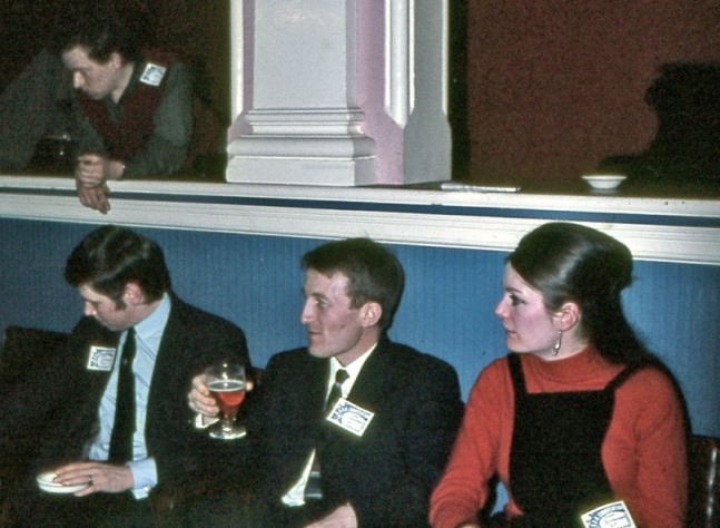 John Brunner was then brought back to address the audience and was as interesting and articulate as one has come to expect. His theme concerned the trend for authors to make their readers do comparatively "more of the work" as they read. Because of the increasing use of symbolism in today's writings a real mental effort on the part of the reader is required in order to grasp the communication which the writer is trying to convey. In fact over the entire weekend much stress was laid on the contribution of what has been termed the "writer's writer" to the field. PETER WESTON: I enjoyed the convention immensely and felt completely at home, no longer troubled by the insecurities of Peterborough or the tensions of Brumcon. I spent most of my time in the bar, with people like Chris Priest, and Tony Walsh with his pretty (but sharp-tongued) wife Simone. Tony absolutely lived for fandom, and he was going to run the following year's convention. In the meantime, he invited us to come along to his BaD group parties in Bristol. John Brunner was there, and I saw him for the first time, icily aloof in red velvet smoking jacket with his terrifying wife Marjorie, who looked and acted like the Duchess of Windsor.