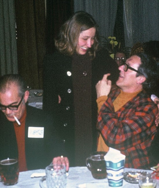 JUNE MOFFATT: It was, and as usual, much of it was in the bar. The bar area provided by the hotel was a large room, with a long bar whereon were placed two bowls of ice cubes at the beginning of the day. These bowls stayed out until the ice melted or it was all used up - usually a combination of the two. As an ice-loving Yank, I learned to grab a Pepsi early in the day, while ice was still available. (I'm not particularly fond of Pepsi, but it was the only cola drink they had.) The far end of the bar was where they had placed the beer and lager kegs - of only academic interest to me, but Very Important to many others there, including Len. LEN MOFFATT: Someone led June and me over to a table where James White was being interviewed by a reporter from the Daily Mirror. Jim, as you may know, is well over six feet tall, and the reporter was quite a tall man, too. They stood up to be introduced to June, who is just a shade under six feet. Jim turned to the reporter and said, "Isn't it nice to meet a girl of average height?" The reporter allowed as how it was. My roommate's day was made. Presently Jim had to leave, and James Blish and John Brunner showed up to be interviewed [...] who did a good job of keeping his note-taking hand busy. About this time we were hauled off to lunch with Eddie and Marsha Jones and Bill and Mary Burns. We went to an Italian-type restaurant called (so help me) Dino's.
