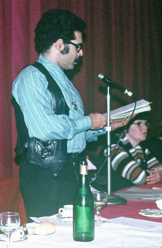 After the AGM I had to appear on Pete Weston's fan panel, along with Ian Williams, Peter Roberts, Jim Goddard, and of course the man himself. I forget what we were discussing, though I'm not sure we knew even then. "Be a bit extreme," Pete hissed to everyone before we began, no doubt realising that the five of us would probably be in substantial agreement on most things, despite his attempt to split us, both physically and philosophically, into two camps: the fannish fans (Ian and Peter Rabbit) and the gimlet-eyed sercon fans (Jim and me). To anyone who's listening I'd like to make another complaint about the set-up of panels at conventions (like the Philip Strick panel, this one I think had the virtue of being well-run and the defect of directionlessness): there are never enough microphones. Admittedly there ought to have been two between the five of us, but one was not working; nevertheless I think a convention ought to be able to get at least four together, so that people on these panels can speak when they have something to say rather than (as always happens at present) when the mike happens to perambulate in their direction. In thit particular instance, I found that whenever the microphone was with Peter Roberts at the far end of the table I had something almost relevant to say, but by the time it had made its way across to me, comments made by the three between us had moved the discussion to an area where I felt I had very little to contribute. Was the same thing happening to the other panellists? Is it general in this kind of situation? If so, is it any wonder that however interesting they look on paper, panel discussions rarely generate anything really worthwhile. I know that if there were more microphones there would be the danger of everybody talking at once, but this might be preferable to the state of affairs when you can't talk when you want to.