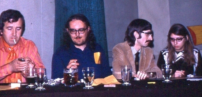LEN MOFFATT: Later, in the lounge, we said goodbye to several, including Jim White, who was remarking on the bit of rain we were getting, and the fact that so many fans were coming down with the sniffles. Said Jim: "I do hope they won't bring their colds to Newcastle." Our goodbyes were more in the nature of a groan. MALCOLM EDWARDS: Once settled in I had a great time, which unfortunately seemed to flash by at about two hours per minute. I'd been looking forward to this convention for a long time, it being the first we'd been able to get to since the 1971 Novacon, and eventually I enjoyed it as much as I had anticipated doing, so that come Monday morning I was just ready for another week or so of convention. And I think Christine enjoyed it much more than she was really expecting to.