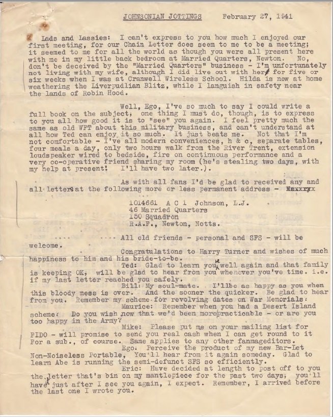 Doug [Webster], Eric [Frank Russell] - Just written to both of you so will say no more here. I'm putting Les [Johnson] after you, Eric, as you're most likely to have his latest address.