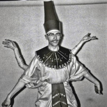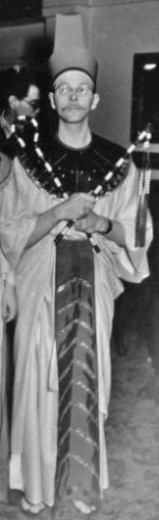 As a result of cartoons by Ray and others such as Lee Hoffman, drawing the propeller beanie on a figure became visual shorthand for a fan and some fans started wearing them to conventions. Several took this further by having multiple propellors on their beanies. Roles decided to take it to the limit and subvert the form entirely with his 'atomic' beanie. Whether this was also intended as a commentary on the arms race is unknown. The tie he's wearing features the famous image of one of E.E. 'Doc' Smith's lensmen as painted by Hubert Rogers for the cover of the October 1939 issue of Astounding Stories.
