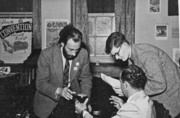 WILLIS: The Convention was due to start at 11am, and we took care and a taxi to arrive shortly afterwards so that in the event of its actually starting on time we should be on hand to carry out those who had fainted from the shock. But all was well ---at 11.30 Ron Buckmaster was still asking everyone if they had seen the microphone. Evidently someone, probably a Northerner, had taken the mike out of the Convention already. Someone suggested he should call for its return over the PA system. While the Committee were mulling over this we all milled around to the strain of Stan Kenton records. At 11.43 precisely Chairman Fred Brown apologised for the delay. He offered no explanation, and nobody expected one. He also announced the last minute cancellation of the showing of 'Destination Moon, due to the London County Council's unexpected objection to the showing of inflammable 35mm film in unlicensed theatres. Eviidently the Government had sneaked through the Cinematograph Act of 1909 without informing the Convention Committee. He also read a postcard from Peter Hamilton regretting that he might not be able to be present. Since Peter was actually standing just under the Chairman's nose, it looked as if he had delivered the postcard himself to save postage. Fred also announced the cancellation of the Junior Fanatics play, adding rather tactlessly that something better would be substituted.