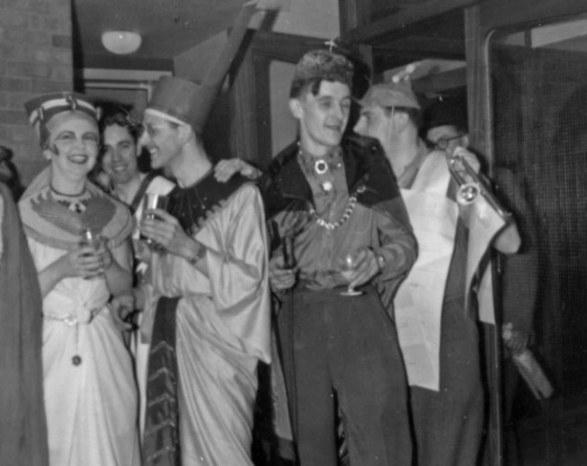 Milling masqueraders Renee MacKay, Stan Nuttall, John Roles,