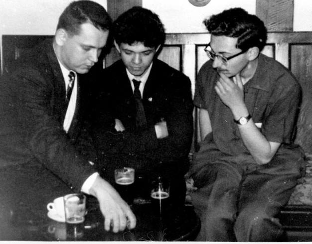 In the Devil's Kitchen (so named for its statue of the devil and assorted infernal devices, including man traps. There is also a weird looking thing that Rusty thought was some terrible instrument of torture. I tried it, and it turned out to be a device for opening the windows) we drank tea and coffee as served at all hours by Bill, the genial waiter. I was also an innocent coat holder in a ferocious duel between Bennett and Shorrock using stamp tweezers as weapons. And so on and so forth. Rusty got tired and so did other people and they drifted off to bed. Being a serious student of games, I was interested in a game called Brag that the English fen play. Ron Bennett and Norman and Ina Shorrock began my education. At first (deuced clever of them) I was an easy winner but this was not to last. Things kept getting worse and worse and when play halted at 4.30 am, I found myself loser to the extent of about twenty-two shillings. Ron Bennett made Brag history by taking in a pot total 4 pounds and 17 shillings on one hand