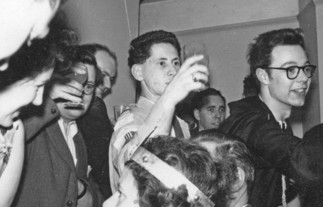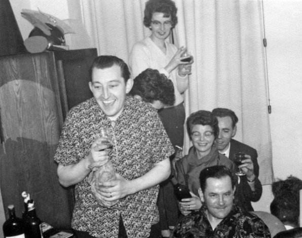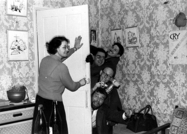 ELLA PARKER: The series of parties began in the room of Alan Rispin. We were having the whale of a time when someone knocked for admission - or so we thought. Our first impulse was to shout: "drop dead", it's as well we didn't because on being told to enter, the countenance of an irate tenant was disclosed demanding that we allow his 2 yrs old child to get some sleep that night. No sense of the fitness of things, some people. Being our first night in the hotel it was obvious that if we didn't want the party atmosphere to dissipate entirely we would have to move to another room. Among the assembled crowd I can’t remember who it was called out the number of the next room we should grace with our company, but the room turned out to belong to Eddie Jones. Eddie was lodged in a single, single room, if you know what I mean. It was already quite crowded when I arrived but still plenty of room for more as we gauge these things. Ian McAulay had seated himself on a piece of the furniture which ensured him of space to breathe if not of comfort and as I was standing next to him it meant that each time the door opened to admit even more fen I had to lean far over him to allow them in. A little of this was too much for Ian and he gave up his seat in favour of standing and taking his chance in the melee. I didn’t waste any time. Before he’d had the chance to decide the best place to stand I had occupied his vacanted place on the furniture. It was now Bob Parkinson’s turn to do the leaning act every time the door opened which was frequently.