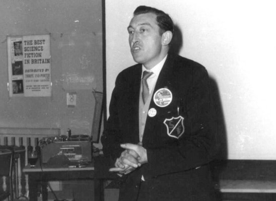 Down at the bar we found almost all London fandom trying to explain fandom to Geoff Doherty, a new BSFA member. He seemed pretty impressed and surprised. That such a group existed, and was asking a lot of pertinent questions, the answers to which he was to put to a good use later. We all adjourned to a Chinese restaurant for food, very good it was too. Much refreshed we made out way back to start our hardworking part of the convention. This was the setting up of the SFCoL table. Don Geldart had done most of the hard work already by making posters, models and planning a suitable layout. Ted and I helped with actually putting it together, while Bruce was busy at the OMPA table, and Jim at the BSFA table. The main items on our table were models of a rocket, with launching rig, personnel and transport. The smaller ship and space station were suspended in a frame against a black background, which was very effective. Whilst Don was busy setting these up, I was stringing together letters, which Don had cut out, to form the name of our club. These spanned across about ten feet and when they were up we were all satisfied that anybody who came into the hall would at least know who we were. It was now time to start our advertising campaign. This year the club made an all out drive to sell the Combozine, which had been specially produced for the occasion. We had adverts which were parodies of current mundane ads such as "Top people read the Combozine", "Unzip a Combozine" and "You're never alone with the SFCoL Combozine". Don had printed over a hundred cards with the inscription 'Get the SFCoL Combozine Now' and these were liberally sprinkled round the hall, into people's pockets, and many other likely and unlikely places. Anyone looking at someone else's display was likely to be confronted with one of the cards. Our greatest success was with Norman Shorrock who after removing cards from the Liverpool stand about a dozen times without ever seeing anybody put one there, came and begged to be allowed to buy a copy, whereupon we presented him with a free copy as he was an honorary member. Ted proved just how unbiased we were by writing on Norman's little card 'We also recommend Bastion'; a little gesture that left Norman obviously unmoved. We set off with Ron Bennett to find something to eat, and just when we were about to order, in walked Dave Kyle. RON BENNETT: Dave and Ruth Kyle were welcome visitors to the convention and are based in this country until the end of May. They will probably be taking a side trip over to the Continent. Dave was last at a convention in this country only last year but we haven’t seen Ruth since the London WorldCon in 1957. Ruth searched diligently for matzoball soup and Dave showed, at a room party, the cine shots he took at last year’s London Convention, shots which had improved several thousand percent over the films he showed at last year’s con and which are now only 100% perfect.