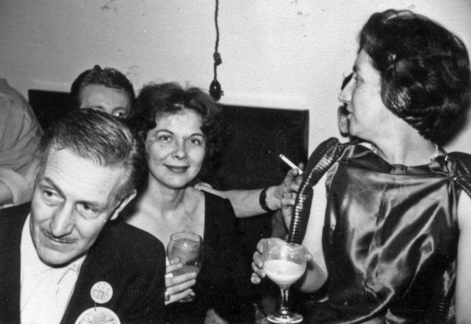 ELLA PARKER: Much later on Saturday night Ethel and I went upstairs to get ready for the company we were expecting to visit our little suite we had to ourselves tucked away in a nice little corner of the hotel. We even had a door which could be shut closing us off entirely from the rest of the hotel any time we felt downright unsociable. Need I say it was never used? The party was held in high good spirits and was an interesting mixture of the faanish and sercon. Here too S-F came in for its share of attention during the jollity. Ethel remarked to me next day of two intriguing conversations, snippets of which she had overheard. To one side they were talking about S-F and on the other there was Phil Rogers and I talking about the fascinating way in which Dave Barber wiggled his ears. This must prove summat, but I don’t know what. We were keeping pretty well open house between the two rooms and as there wasn't room for all of them in Ethel's place the overflow was passing through into mine. This makes it difficult to know who was at ours and who had gone off looking for another party elsewhere. I do remember seeing Phil Rogers, Dave Barber, Don Geldart, Ted Carnell (who had turned up unexpectedly and most welcome he was too), Jimmy Rattigan, Ted Tubb, Ted Forsyth, Joe Patrizio, Alan Rispin and Diane (that name again!), Brian Aldiss, Brian Jordan, Jhim Linwood, Jeff Doherty, Ian McAulay (you could have guessed he’d be there!), two Shorrocks', Kingsley Amis, Ken Slater, Bobbie and Bill Gray, Ron Bennett, Bruce Burn, Daphne Buckmaster, Keith Freeman, Margaret and Eric Jones, and last but not least Arthur Thomson, who had come down for one day and was acting barman very capably. It was a good party.