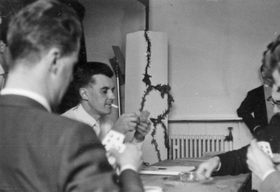 The meeting was, in effect, chaired jointly by Ken Slater and Bobbie Gray - Ken because he was this year's Con Chairman, and Bobbie because she'd been conducting the BSFA business meeting. It started half an hour later than scheduled (people were eating) and gradually snowballed as more and more fans crowded into the little lounge, many of them quitting 'Orphee' (which, though I didn't see any of it myself, I understand called for considerable devotion to fandom on the part of those leaving it) in order to be in on the deliberations. And we argued and we argued and we argued. We argued round in circles, in fact. Somebody would say something, suggest somebody's name perhaps, or ask a question. The suggestee would decline "on the grounds that...", or the question would be answered, Ken or Bobbie would complete the circular argument and start again in the same place as before. More suggestions. More regretful refusals. More questions. And somehow the shape of the circle would subtly shift, as Ken (or Bobbie) started the argument again - from (if it were possible) a slightly different side of the same place. And suddenly the circle was broken. Some subtle shift in the formula some illumination sparked by a casual but pointed interjection from somebody, had left open a way out of the circle. And Tony Walsh - may much egoboo accrue to his name - had agreed to accept the job. If he hadn't, I think we could easily have been there all night. I understand they elect Popes the same way. But I'm damned if I can remember a word that was said - or by who. RON BENNETT: At an extra-ordinary business meeting on the Sunday evening in the Wakeford Lounge a goodly proportion of the attendees gathered to discuss plans for holding next year's convention in Peterborough. Ken Slater pointed out that he could not afford the time away from his business to put on next year's convention but was willing to take charge of professional displays. George Locke said that he would be willing to produce the convention's newsletters and Ken Slater said that he would also be willing to look after the hotel bookings. At the end of the meeting Ethel Lindsay staggered out to find herself in charge of the 1964 programme. She was supported (yes, held up) by Tony Walsh who looked shaken himself - he will wake up to find himself Convention Chairman, Secretary and Treasurer, a formidable combination. Peter West offered to provide and put on the films and is asking anyone to suggest titles of both professional and/or amateur SF films they would like to see next year. How about The Trouble With Harry, Peter? BRIAN VARLEY: After the film, which finished shortly after midnight, there was a small gathering in 258. A dozen or so fans spread comfortably over chairs, beds or floor, a drink in hand, good conversation and a pleasant atmosphere made it a joy to be there. We learnt the Aldiss method for finding plots and this is now available to aspiring writers, price ten shillings, and will be forwarded under a plain brown cover. We would also like to offer Mack Reynold's method but he was too busy trying to persuade someone to play with his toes. Tom Boardman was holding forth on the publishing life in general and the peculiar habits of certain writers in particular. John Brunner was holding forth... Altogether a very pleasant evening and a most enjoyable end to the convention. There is an opinion, widely held, that all parties should be open to all comers, and there is much to be said for the spirit behind this. Personally though I can only truly enjoy a party if there is room to breathe and move in. I attended both parties in 258 and must say that the Sunday evening "closed" session was infinitely more preferable... but then I am speaking from the inside. BRIAN ALDISS: And so the Sunday wore delectably on. Kingsley returned to Cambridge by taxi, most of the rest of us - and that makes about 169 - saw one or both of the two films, "Metropolis", and Cocteau's "Orphee". The latter has most powerful symbols of death and the unknown, but the former was the more popular; in the immortal words of Skyrack, "There were many impromptu remarks from the audience". So the gaiety went on unabated. When Tom and Joyce Boardman dragged Margaret goggle-eyed from "Metropolis", we went and had a drink in the notorious Room Five, where the Brunner's massive dog was just finishing the remains of a delicious fan. Serious discussions then took place, on the subject of whether world conditions had not seriously deteriorated since women were given the vote. On the bed John Brunner and Bruce were entertaining Margaret and Joan Harrison with the exploits of Feghoot. I sold one of my oil paintings to Bruce for an undisclosed sum. Eric Bentcliffe suggested that since people got tired, all-night parties should in future be held during the afternoon.