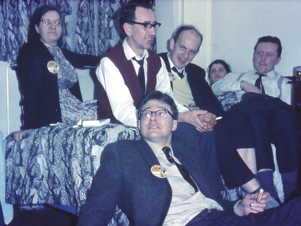 The parties were fun... yes. But there was a continual feeling that the Fun was a trifle unnatural or forced. I wonder how many people enter fandom as in escape; correspondence can so easily and successfully disguise the social outcast or introvert, enabling him to become whatever sort of person he pleases, until his correspondents meet him — and so often find that the person they have been writing to is not what his letters sounded like at all. I would guess that in most cases the image of himself that a letter-writer builds up is more glamorous than he really his; consequently it is hardly surprising that the social atmosphere was 'forced' on Saturday night, with natural introverts trying hard to be extraverts. There was a slight feeling of 'why I am I staying up for this?' and indeed it seemed the main reason was, 'because everyone else is'.