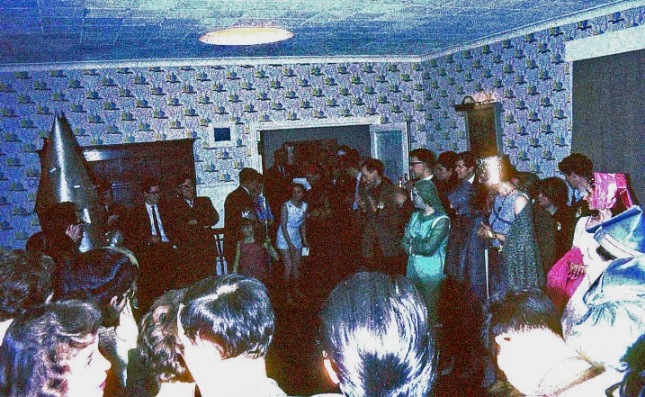 Fancy Dress. Ethel Lindsay enters the room in same nurse costume as 1962, minus necktie. Note also Tony Walsh's rocket on far left. (pm).