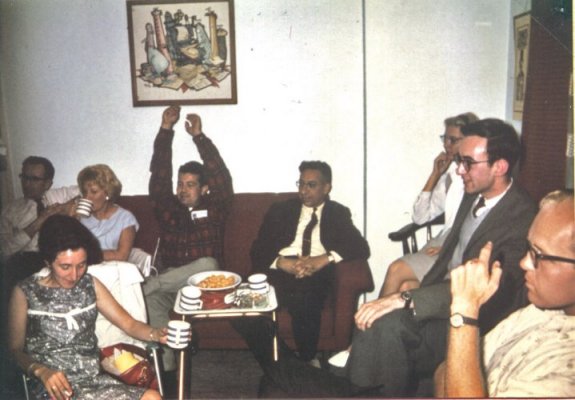 people?" The first people I saw that I knew, aside from John himself, ware the Silverbergs, who were chatting with Don Wollheim. I joined them, and after a spell the Pohls and Betty Ballantine came in. I chatted with Betty for fifteen or twenty minutes; this was the first time I'd met her. John joined us far a spell, and introduced us to a tall, cadaverous- looking man who was a Scientologist, and we discussed the pros and cons of hypnotism, which Scientology is rather strongly opposed to. My own feelings are by no means that strong, but I've had reservations about hypnotism. John on the other hand was rather enthusiastic about it. But too quickly more guests had arrived and he was back to his duties as host. Then a new party arrived, and it was Arthur and Olive Thomson, Boyd Raeburn and the Carrs. I joined them in the kitchen for drinks. I'd helped exhaust the cider and was now trying a mild wine. I was all too aware that my metabolism was not yet in harmony with the time or place, and I'd best go slow and easy. Don Wollheim was in the kitchen too, and he, Terry and I were confronted by a woman with flaming red hair.